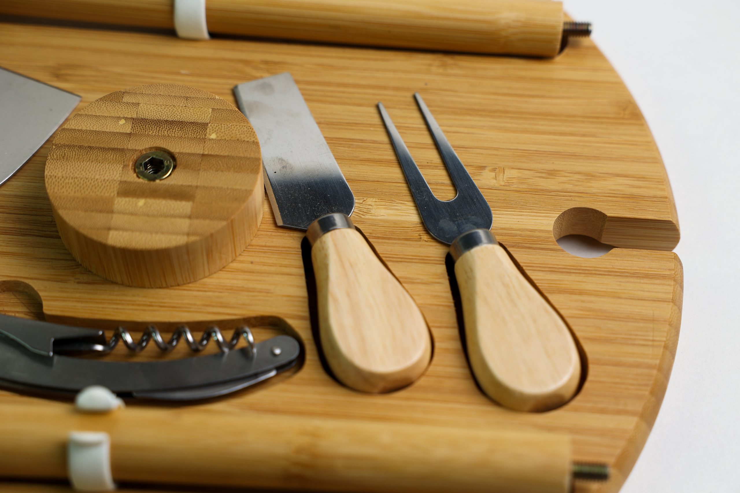 The set includes a variety of cheese knives, a serving fork, and a corkscrew, making it easy to slice, spread, and serve different types of cheese while opening your favorite bottle of wine. The durable bamboo surface is perfect for presenting cheeses, charcuterie, fruits, and snacks for guests.