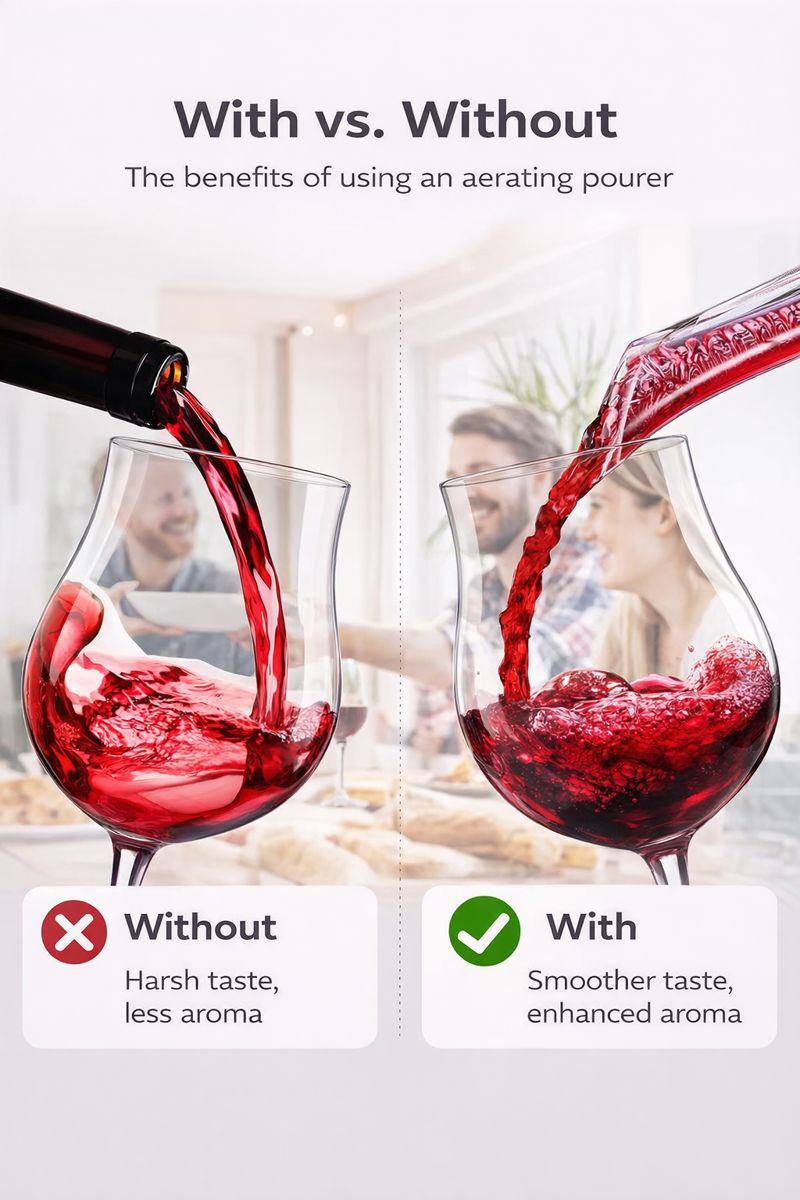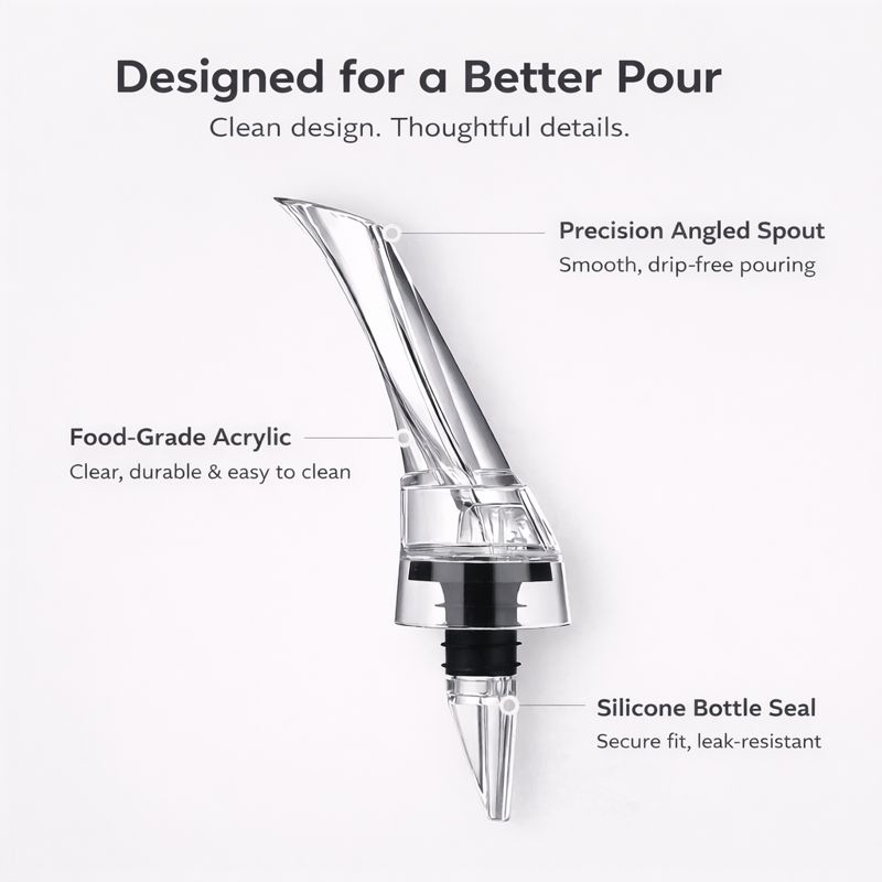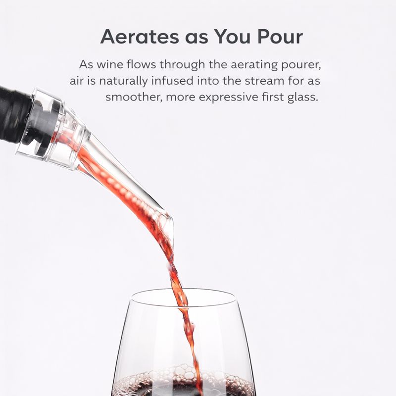 Wines benefit from being aerated before being served to enhance flavour, bouquet and smoother finish. The aerating pourer allows instant by-the-glass decanting.
